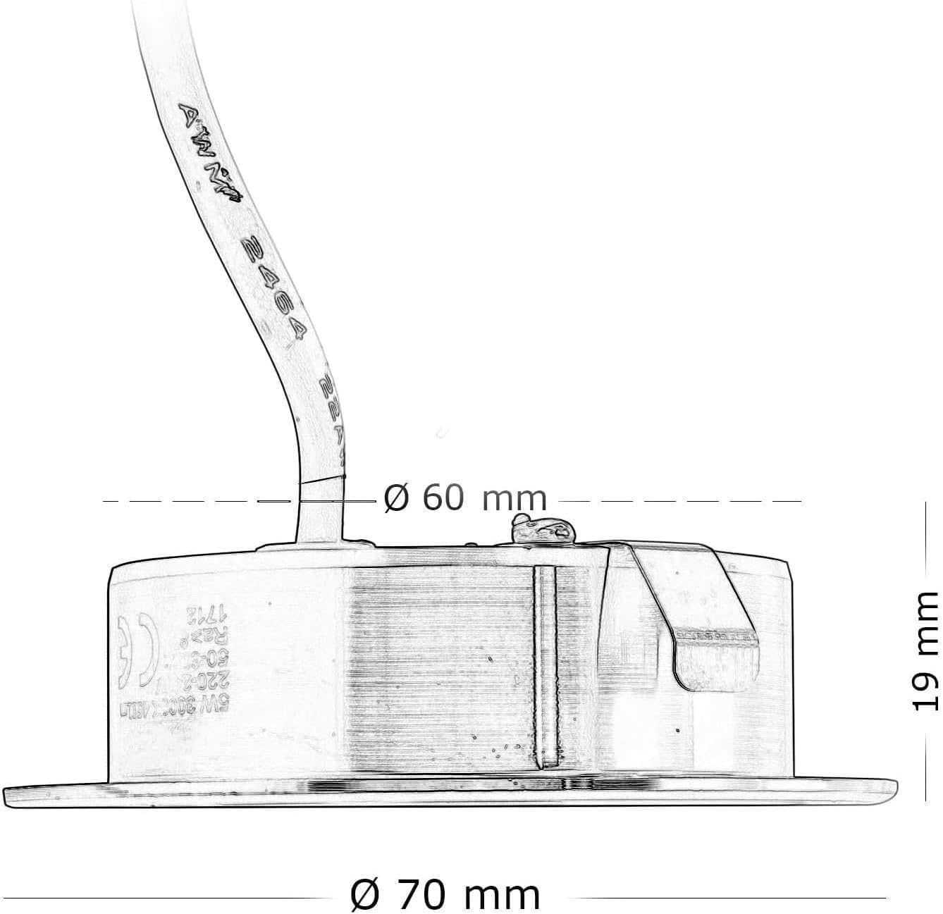 - 2.Design compatto e installazione facile – Diametro esterno Ø 70 mm, foro Ø 55 mm, spessore 18 mm. Struttura leggera in alluminio + PC con clip a molla integrate per un montaggio rapido e sicuro.