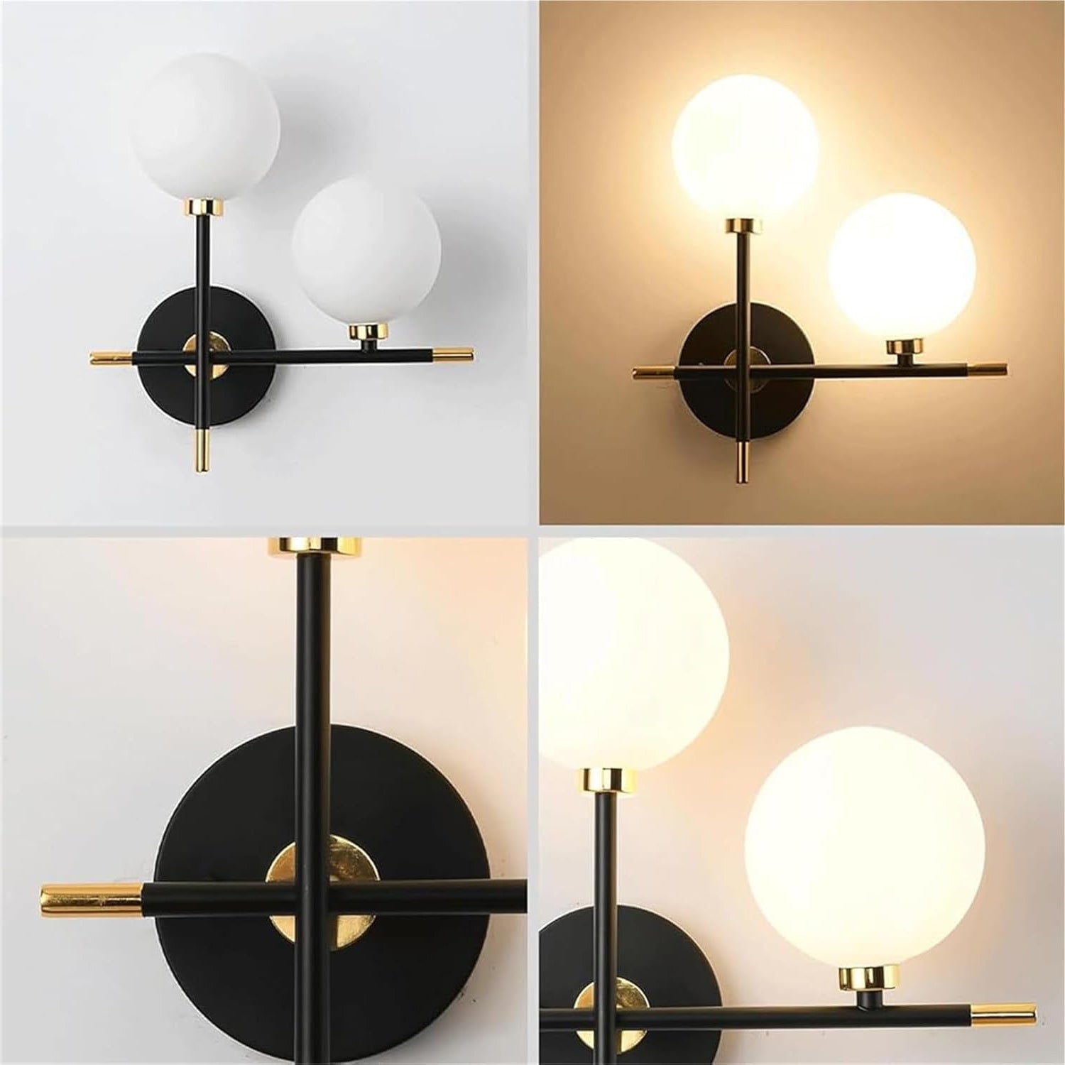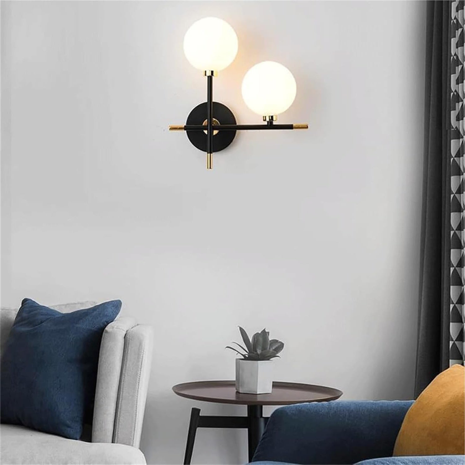 - 1. đź’ˇ DESIGN MODERNO A DUE LUCI Applique da parete con struttura in metallo nero e dettagli in ottone, dotata di due sfere in vetro opalino. Stile elegante per valorizzare qualsiasi ambiente.