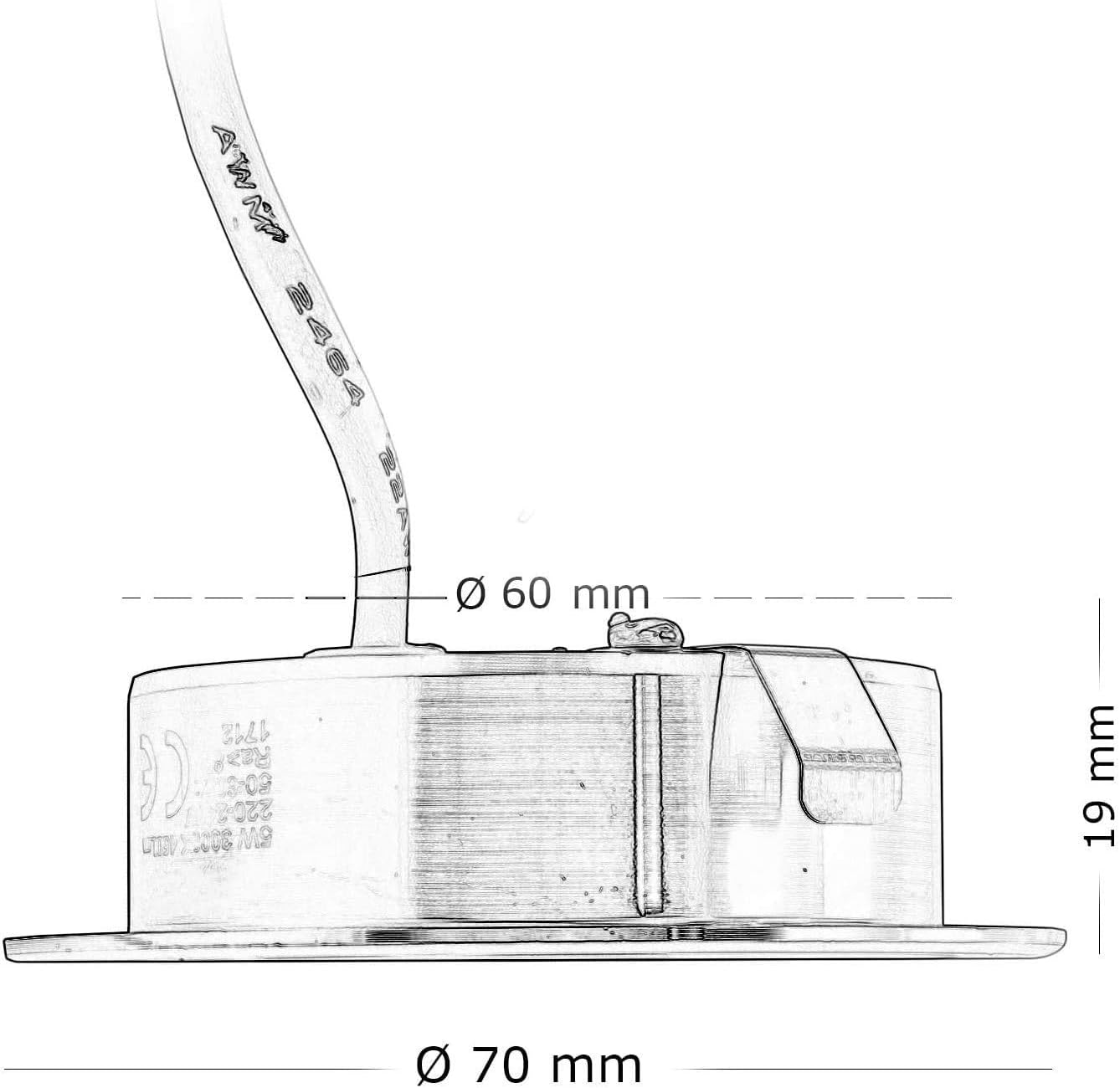 - 2.Design compatto e installazione facile – Diametro esterno Ø 70 mm, foro Ø 55 mm, spessore 18 mm. Struttura leggera in alluminio + PC con clip a molla integrate per un montaggio rapido e sicuro.