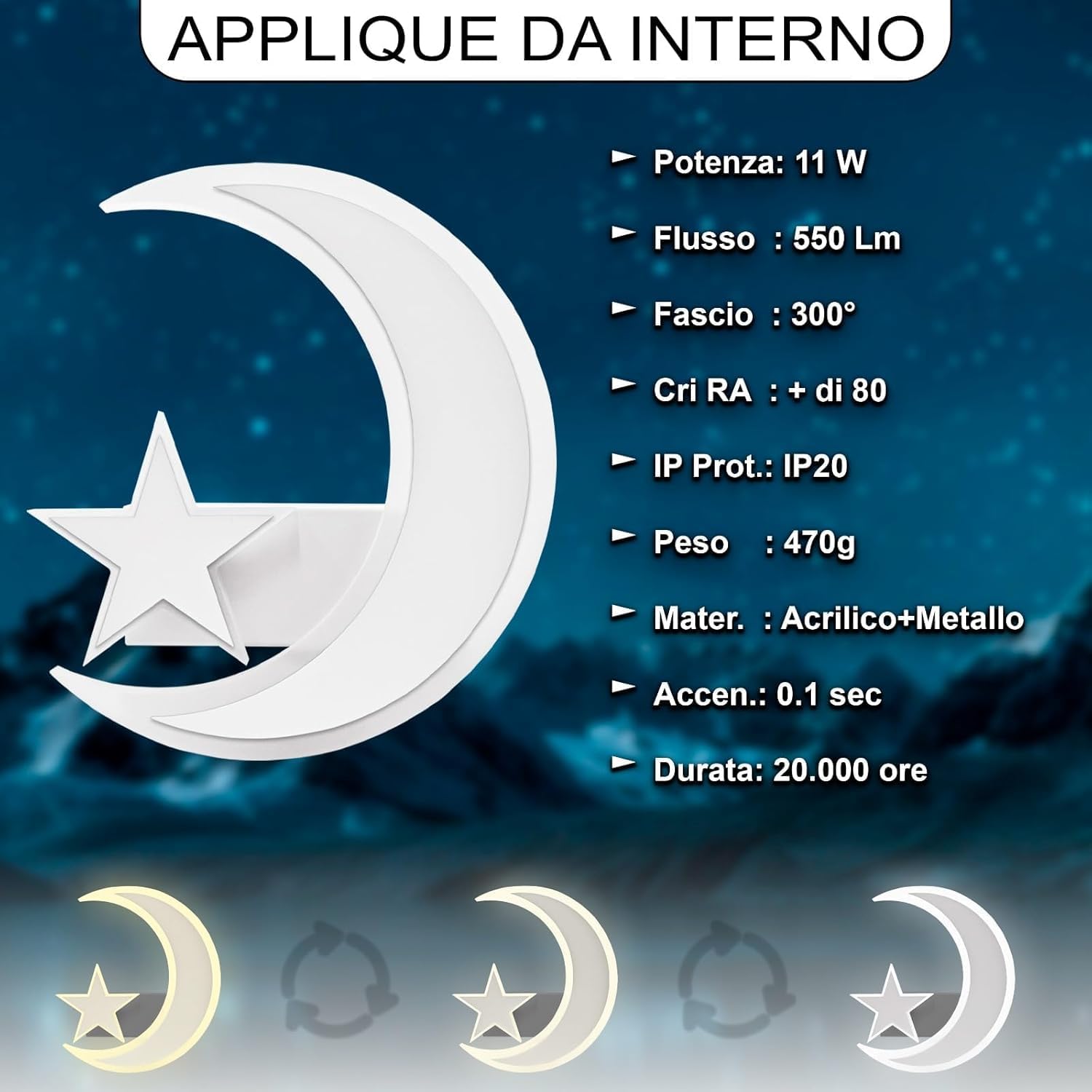 TEKHOME Applique da muro LED 11W design luna e stella, lampada decorativa da parete moderna 3000K-6500K, bianco E47-3C
