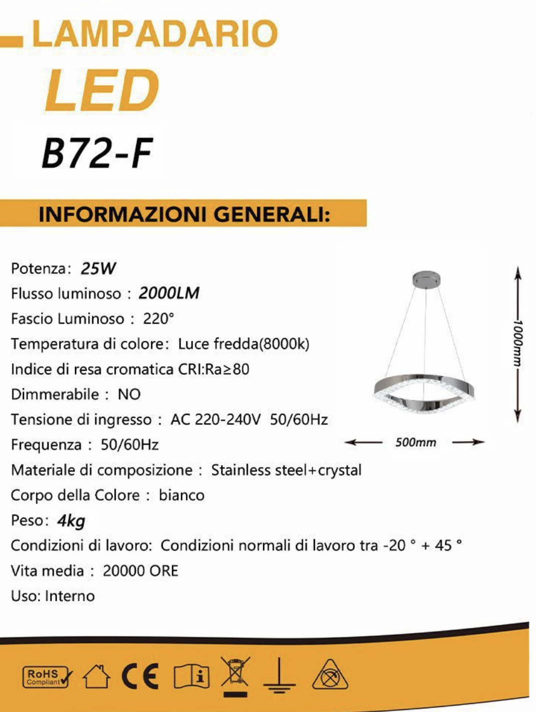 - Con una potenza di 25W e un flusso luminoso di 2000 Lumen, questo lampadario LED offre un'illuminazione efficiente e brillante. La luce fredda bianca (8000K) crea un ambiente luminoso e vibrante, ideale per illuminare cucine, sale da pranzo o soggiorni di medie dimensioni.