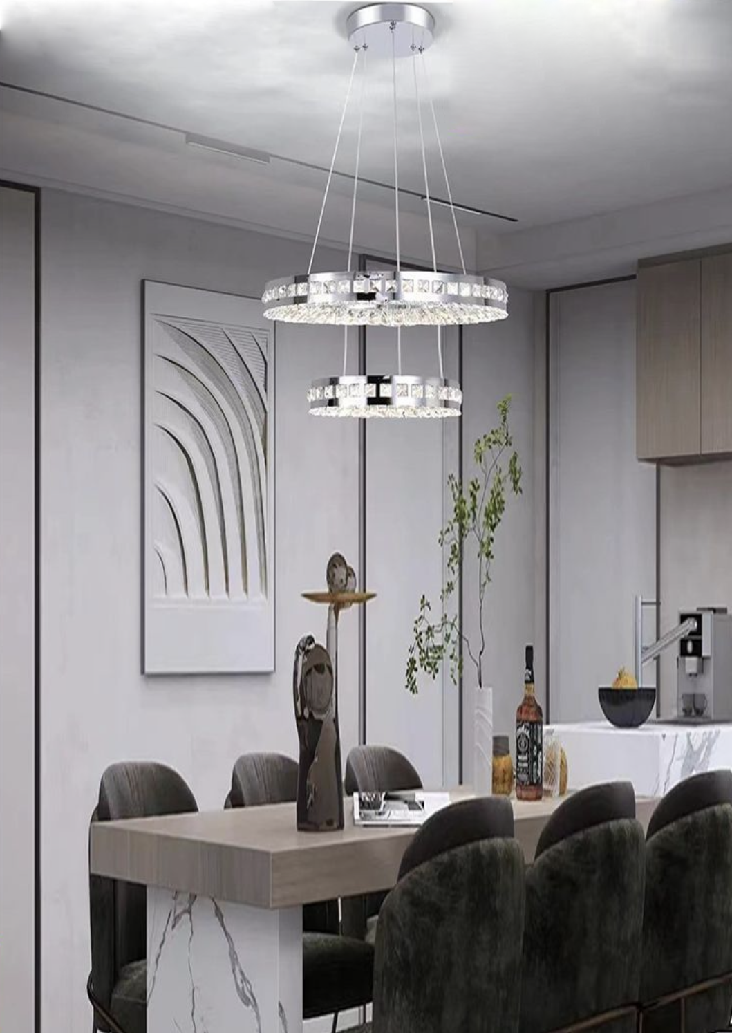 - Lampadario moderno e luminoso con struttura in acciaio inossidabile bianco e decorazioni in cristallo trasparente. Il design elegante si adatta perfettamente ad arredamenti contemporanei, aggiungendo un tocco di classe al tuo soggiorno o sala da pranzo.