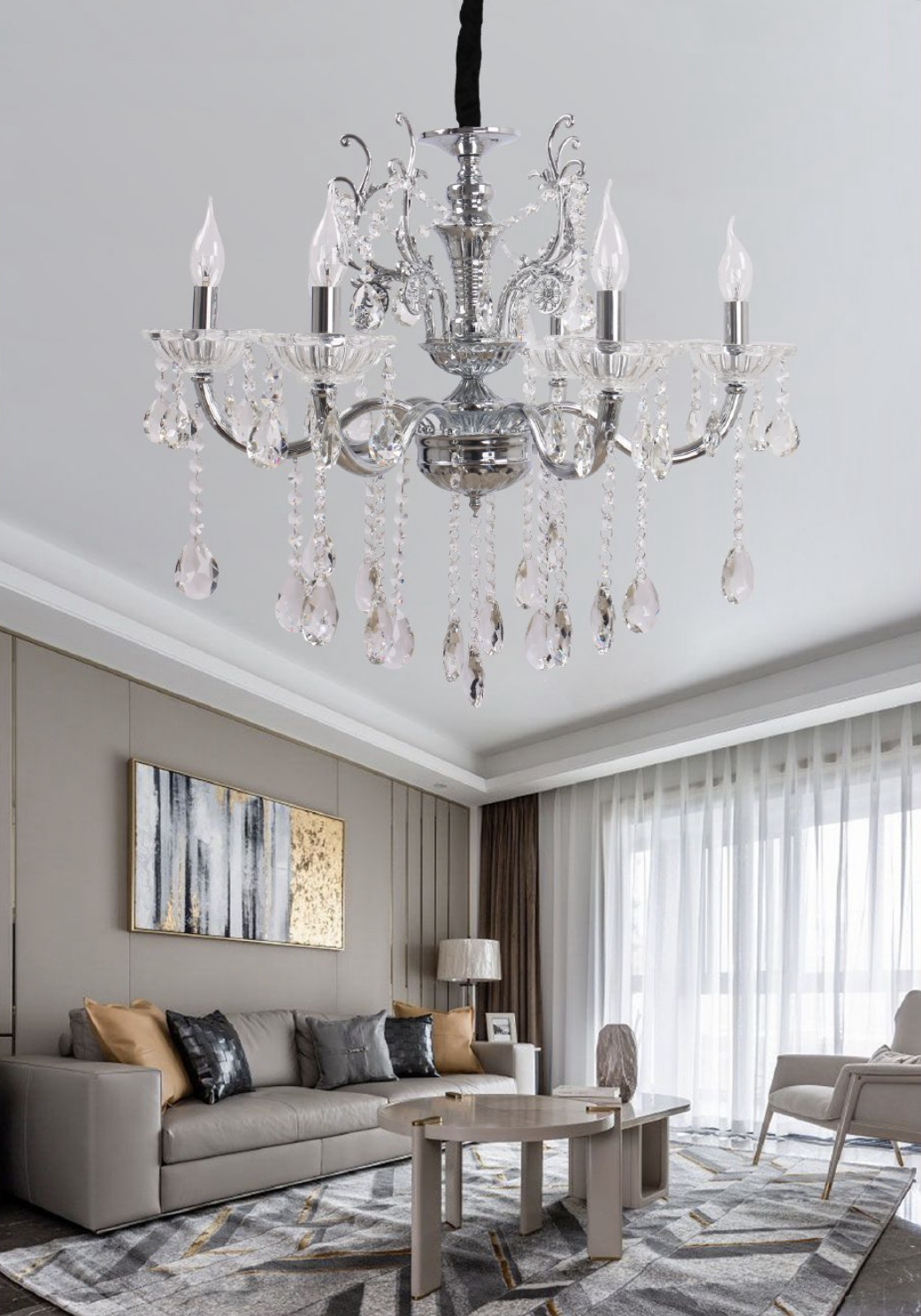 TEKHOME Lampadario Sospeso Design a 6 Luci con Struttura Geometrica e Paralumi in Vetro, Stile Moderno e Minimalista, Attacco E14 40W, per Interni, Diametro 65cm, Argento (Senza Lampadine) A18-A