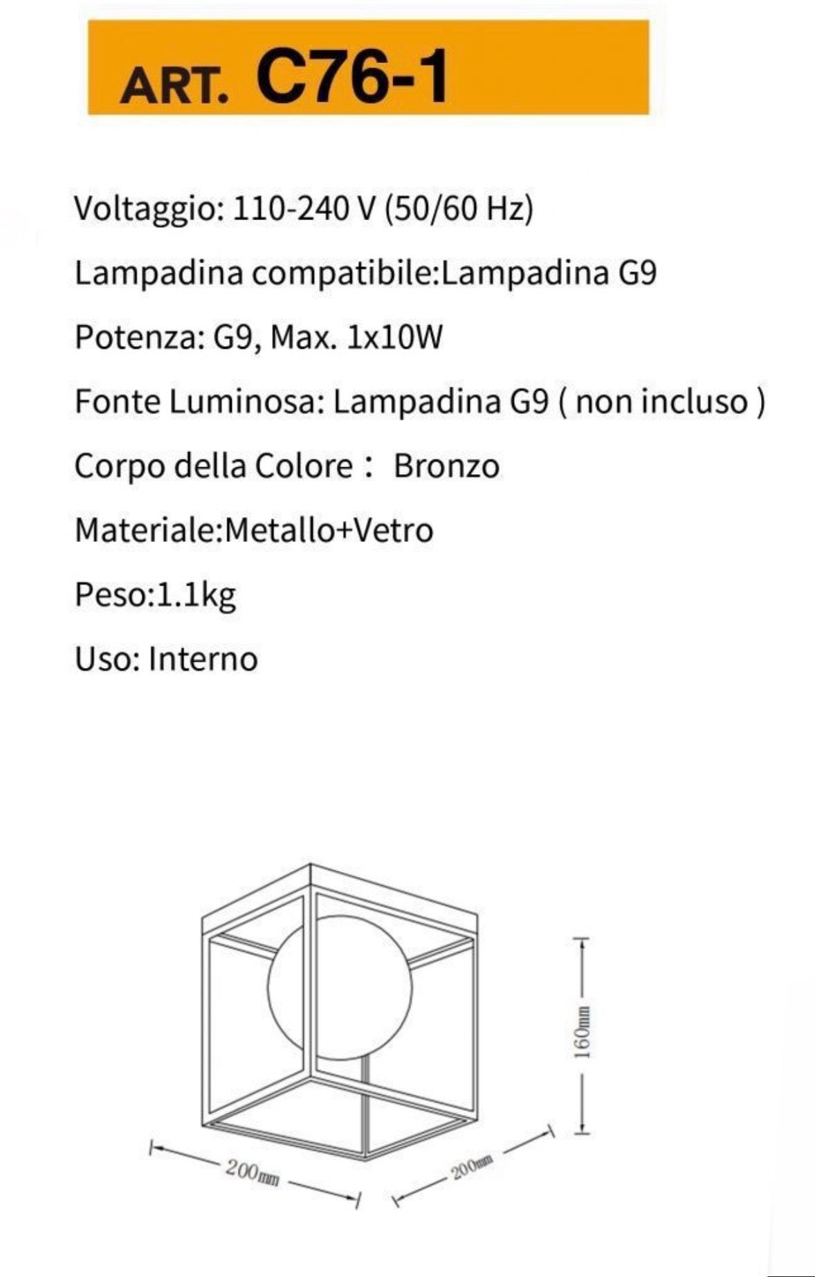 - Tensione di ingresso: 100-24V 50/60Hz - Colore: Nero e Bronzo - Dimensioni: 20x20x16 cm - Materiale: Metallo e vetro - Peso: 1,100 Kg